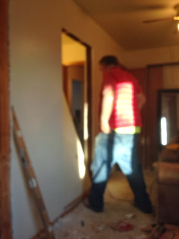 Wow! Three walls came out yesterday! It's a little dusty, but I love it better already! Jack even got in on the action with helping to take out the bathroom tile and pull down the wallpaper border. Then he helped Matt carry load after load of wood and wall pieces. So a lot got done yesterday thanks to two very fun men in our church who worked so hard to help us. Thanks, Marvin and Aldo! And Karen brought some lunch which made it even better!